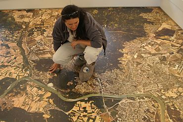 Foto 11 - vpravo: Letecká mapa regiónu (vrátane Bratislavy) z výšky, z akej vidí lužný kraj orliak morský. Aj ten už bol zaradený medzi vyhynuté druhy v týchto končinách, ale opäť tu hniezdi. Deti s radosťou behajú v špeciálnych papučiach po ortomape, hľadajú známe cyklotrasy, letiská, domy, v ktorých bývajú.