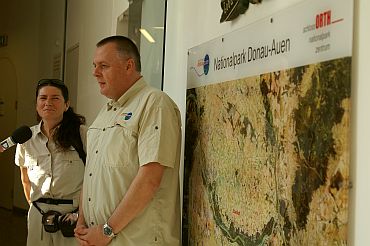Foto 2 - vľavo: Návštevnícke centrum národného parku Dunajské Luhy sídli v stredovekom hrade v Orthe a jeho riaditeľom je Slovák Igor Stahl. Národný park sa rozkladá na 9 300 hektároch, jeho hlavnou úlohou je rušiť následky prehnanej regulácie Dunaja, pospájať hlavný tok s jeho starými ramenami a zachrániť tak luhy v ich pôvodnej podobe. V mokradiach národného parku našli útočisko ohrozené druhy, napríklad korytnačka močiarna a ryba blatniak. Návštevnícke centrum ponúka exkurzie, pešie túry, splavy na gumených člnoch a kanoe. Ročne navštívi park približne milón ľudí, 40 000 z nich si pozrie aj výstavy v zámku, vrátane filmu o vzniku a premenách lužného lesa a detského predstavenia v kulisách barokového divadla. Deti si tu s nadšením robia selfíčka „na dne Dunaja“ a posielajú ich obratom na e-mailové adresy kamarátov. Sezóna, počas ktorej majú otvorené, trvá od 21. marca až do 21. novembra. RNDr. Katarína Zlochová, ktorá často jazdí do práce z Bratislavy na bicykli, pracuje v národnom parku od jeho začiatku. Pripravuje preklady prospektov do slovenčiny, tlmočí a sprevádza skupiny, najmä tie zo Slovenska. Desať percent návštevníkov prichádza zo Slovenska, často sú to celé rodiny a exkurzie žiakov slovenských škôl, školské autobusy prichádzajú dokonca až z Liptovského Hrádku, hovorí.