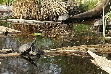 Foto 4 - vľavo: Zámocký ostrov s umelým jazierkom predstavuje „mokraď v malom“, areál, v ktorom môžete pozorovať typické zvieratá a rastliny lužnej krajiny. V NP rastú fialky (25 druhov), orchidey, konvalinky, zvončeky, žije sto druhov chrobákov, ďatle, kuviky, veveričky, vandrujú jelene, pobehujú diviaky. Raritným obyvateľom je vzácna európska korytnačka močiarna (Emys orbicularis). V minulosti sa vyskytovala bežne v celej Európe, v súčasnosti sú dunajské lužné lesy posledným prirodzeným miestom jej výskytu. V jazierku na ostrove ich žije dvadsať. Studenokrvné korytnačky sa často vyhrievajú na kmeňoch stromov, ktoré ležia vo vode, a tam vidíte Emy úplne zblízka a môžete si ich vyfotografovať.