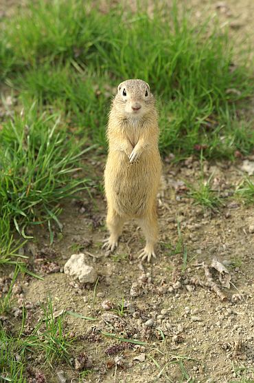 Foto 6 - vľavo: Každý si rád odfotí panáčkujúceho sysľa. Sysľov tu žilo neúrekom, hospodári ich však nevideli radi, lebo im ničili zásoby. V blízkosti kolónie sysľov nájdete „hotel pre hmyz“, suché spráchnivené drevo s dierami pre mnohé ohrozené druhy hmyzu a pre divé včely a osy.