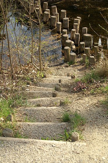 Foto 5 - vpravo: Takéto ohryzy prezrádzajú bobra vodného. Bobry sú vegetariáni, kedysi ich zabíjali kvôli hustej kožušine, kvôli pižmu a kvôli tomu, že ich mäso sa považovalo za pôstne jedlo. Nečudo, že koncom 19. storočia v Rakúsku vyhynuli, znovu sa tu usídlili v 70. rokoch 20. storočia. Prečo bobor obhrýza a váľa stromy? Lebo musí obrusovať zuby, ktoré mu ustavične rastú. A stromy váľa preto, lebo mu najviac chutia jemné konáriky a šťavnaté puky. Bobor dospieva ako dvojročný, žiaden mama-hotel u neho neexistuje, po dvoch rokoch života si robí vlastnú noru.