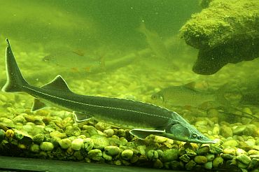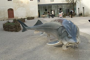 Foto 9 - vpravo: Na nádvorí stojí socha vyzy dunajskej v životnej veľkosti. Niektoré exempláre sa dožívajú aj 80 rokov, vyza dáva veľa mäsa aj kaviáru.