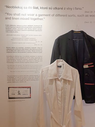 V domácnostiach, ktoré držia kóšer, sa tento pojem netýka len jedla, ale aj odevov. Na stene visí modré sako, biely vyšívaný kitl, mužský slávnostný odev na jom kipur a významné sviatky. Na paneli čítame konkrétnu pasáž z Tóry: neobliekaj sa do šiat, ktoré sú utkané z vlny a ľanu. Vlna a ľan sa nemôžu stretnúť v jednom oblečení, keďže vlna sa vyrába zo zvieraťa a ľan z rastliny. Vystavený kabát má našitý štítok, ktorý zaručuje, že je kóšer. To isté sa týka aj gombíkov, nití, podšívky, všetko musí prejsť kontrolou. Ten, kto si chce byť istý, že jeho odev je kóšer, si ho môže dať otestovať v špeciálnom laboratóriu, najbližšie je vo Viedni.