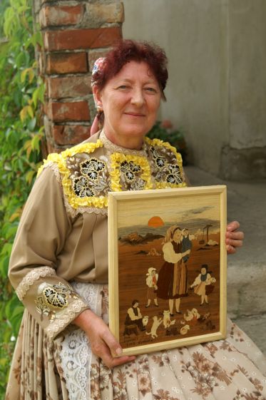 Keď som zakončila základnú školu, nešla som študovať ďalej, neboli peniaze, zostala som doma pracovať. A pretože naša Kovačica je poznatá po maliaroch, maľovala som i ja. No maliarov toľko jesto, že som sa nakoniec rozhodla pre intarzie, ako sme sa to učili v škole. Okrem mňa to nikto nechcel robiť a dnešní mladí o to nemajú záujem, lebo je to strašne namáhavá práca. Načim kúsok po kúsku sekať a na to načim nervy. V dnešnej dobe sa na také nikto nedáva. Áno, myslím si, že ja som z poslednej generácie, ktorá sa takto baví. A ja už som si zvykla, je to moje hobby, hoci mi jeden obraz trvá aj dvadsať dní.