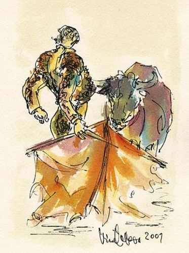 Raz, to boli deti ešte malé, sme všetci šli na koridu, ktorá je tu uznávaným rituálom. Síce krutým – a naozaj stačilo vidieť toto predstavenie jediný raz – ale zároveň aj istým spôsobom krásnym. Fascinovala ma odvaha a gracióznosť toreádorov, nádhera ich kostýmov, a predovšetkým sila a vytrvalosť býkov, sú to ušľachtilé, veľkolepé zvieratá, symbol mužskej energie. Namaľovala som sériu akvarelov s tematikou býčích zápasov. Pre kompenzáciu ženskej energie som maľovala aj tanečnice flamenca.